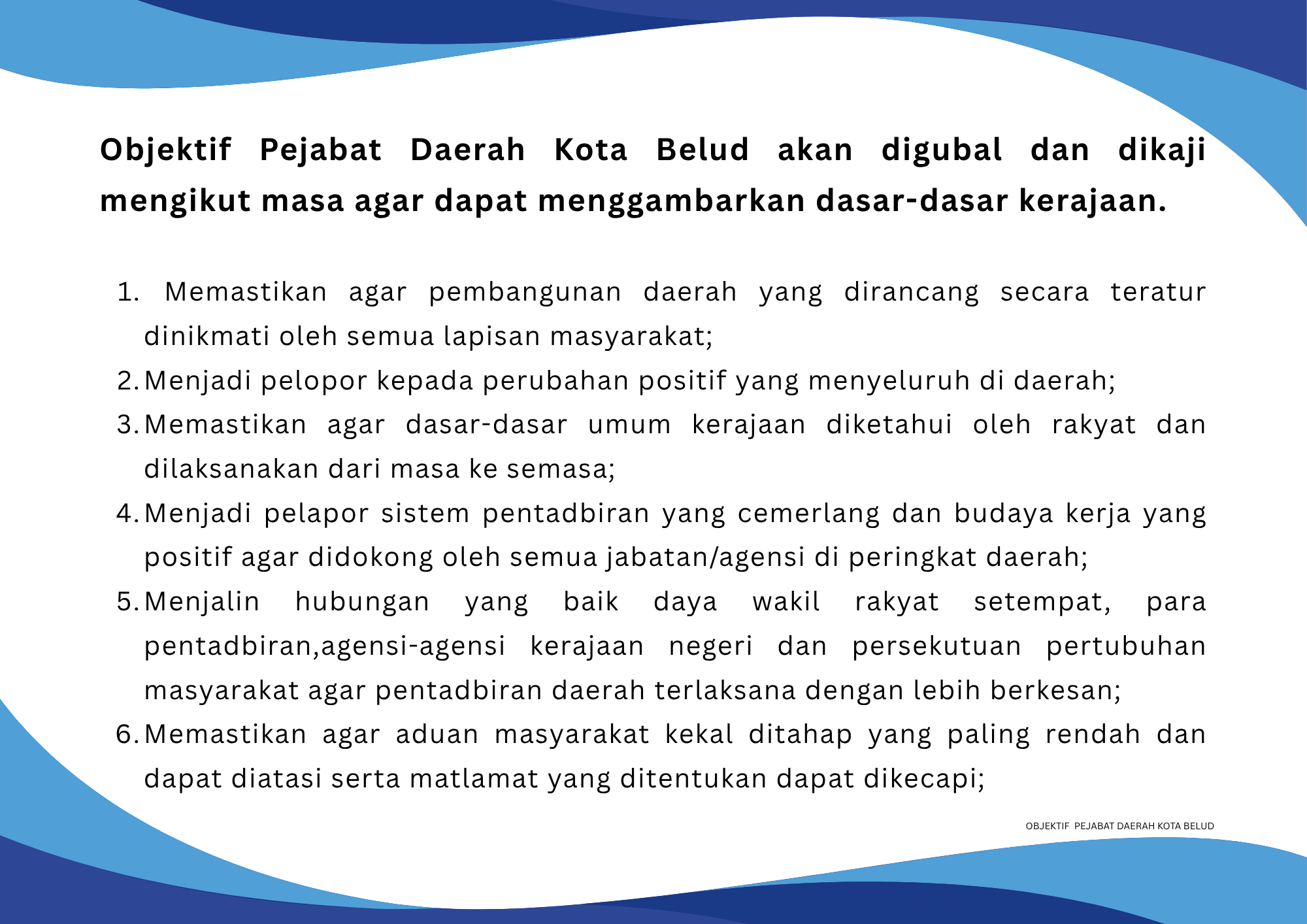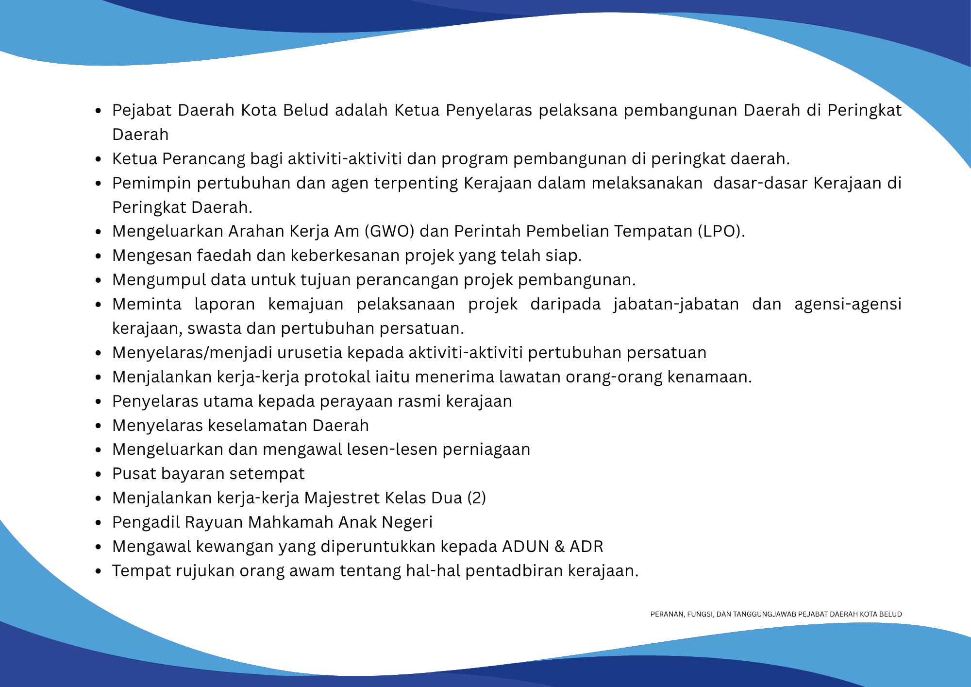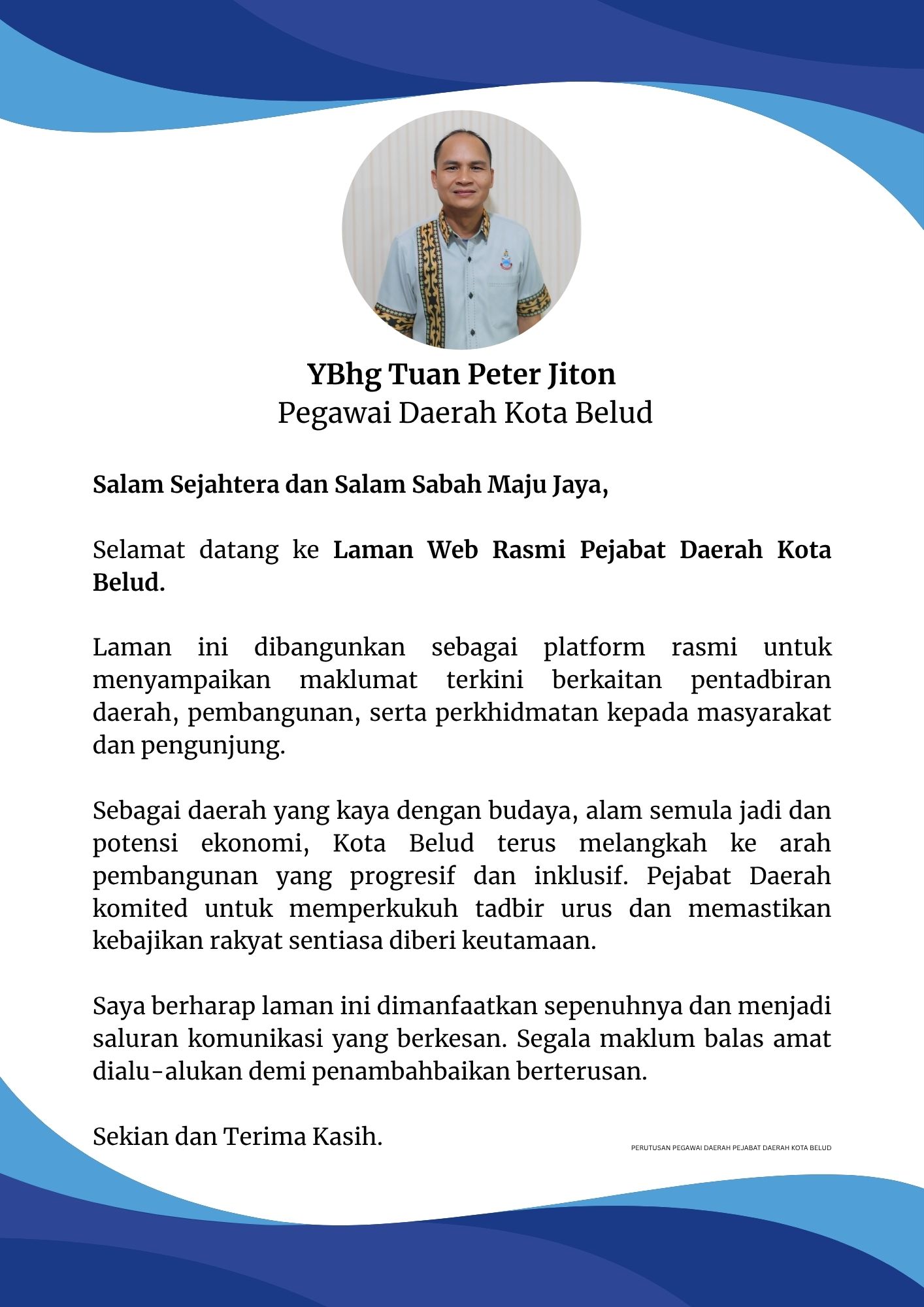 Pejabat Daerah Kota Belud memainkan peranan penting dalam pentadbiran, pembangunan, dan pengurusan komuniti di daerah ini. Struktur organisasi ini menggambarkan pembahagian tugas dan tanggungjawab setiap jabatan serta kakitangan dalam memastikan perkhidmatan yang cekap dan berkesan kepada masyarakat. Dengan kepimpinan yang tersusun, pejabat ini berusaha untuk melaksanakan dasar kerajaan, menggalakkan pembangunan lestari, serta meningkatkan kesejahteraan penduduk Kota Belud.